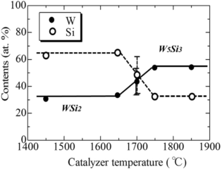 在溫度分別為1750℃、1450℃下,采用電子顯微成像分析測量了鎢和硅的含量,結果如圖4(a)、(b)所示,清晰的看到鎢熱絲表面轉換成了其他類型的層,這些層包含著鎢和硅。圖5總結了硅化物相變化隨著溫度(Tcat)的變化情況[23]。