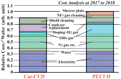 圖3為采用Cat-CVD和PECVD大規模生產SHJ太陽電池的成本分析,是基于日本ULVAC公司最新的研討會上展示的大規模生產設備而得到的[20]。這項成本分析中,所有的基礎消耗成本,如天然氣、電力成本,均根據日本的數據評估的。