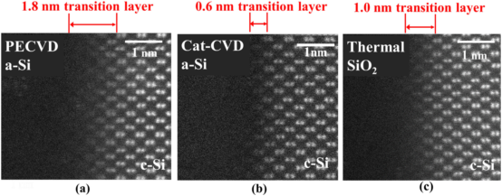 圖1不同界面的STEM圖(a)PECVD制備的a-Si/c-Si,(b)Cat-CVD制備的a-Si/c-Si,(c)熱生長制備的SiO2/c-Si。從c-Si到a-Si或SiO2的過渡層寬度已被標注