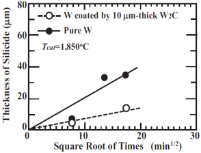 圖7 工藝時間的平方根與純鎢絲、鎢絲上附著10μm厚W2C分別形成的硅化物厚度的關系